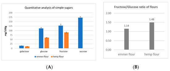 (A) Quantitative analysis of simple sugars in emmer and hemp flours (mg/100 g); (B) fructose/glucose ratio in emmer and hemp flours.