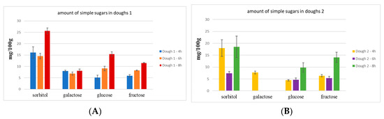(A) Quantitative analysis of simple sugars in doughs 1 1; (B) quantitative analysis of simple sugars in doughs 2.