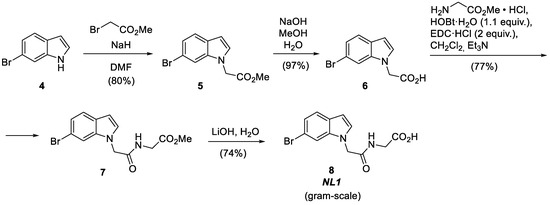 The NL1 molecule is the simplest one in terms of structure and synthesis [2]. NL1 is synthesized from 6-bromoindole in four steps by attaching the short peptide-like chain to the indole nitrogen atom (Figure 3). First, 6-bromoindole 4 is alkylated with bromoacetic ester and then hydrolyzed to yield 2-(6-bromo-1H-indol-1-yl) acetic acid 6 [9,10]. The subsequent reaction of the latter with glycine ester hydrochloride under peptide synthesis conditions creates an amide bond [11].