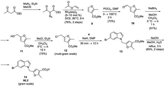 NL2 is one of the most promising bCSE inhibitors [2]. Its structure is based on the 2-methylfuran-3-carboxylic acid derivative in combination with 6-bromoindole linked via a methylene bridge. NL2 is synthesized by coupling these two fragments, followed by the hydrolysis of the ester group in the last two steps (Figure 4). Methyl 5-(chloromethyl)-2-methylfuran-3-carboxylate 12 is obtained in three stages from methyl 2-methylfuran-3-carboxylate 9 [13,14,15] and is used as the furan building block for coupling with 6-bromoindole. Methyl 2-methylfuran-3-carboxylate 9 can be obtained in one step by the rhodium-catalyzed cyclization of vinyl acetate with ethyl diazoacetate [16]. Next, methyl 2-methylfuran-3-carboxylate is introduced into the formylation reaction, followed by the reduction of the aldehyde group with sodium borohydride [13] and the replacement of the hydroxyl by chloride by treatment with mesyl chloride to produce the essential intermediate compound, methyl 5-(chloromethyl)-2-methylfuran-3-carboxylate 12 [15]. This synthetic pathway was significantly optimized during this work to obtain multigram quantities in high yields, which allowed us to obtain the NL2 molecule in near-gram quantities.
