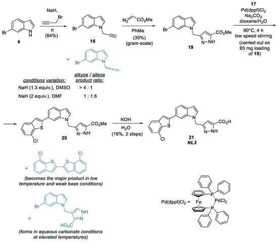 The resulting product 19 is introduced into a Pd(dppf)Cl2-catalyzed cross-coupling reaction with the previously synthesized (7-chlorobenzo[b]thiophen-2-yl) boronic acid 17 under thoroughly selected conditions. The target product NL3 is then easily obtained by the hydrolysis of the ester group, yet the cross-coupling step limits scaling due to the complexity of this stage and the low reactivity of the building blocks being coupled.