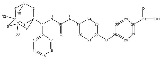 It was obtained similarly to the compound (8a), by method A, from 200 mg of compound (5b) and 160 mg of trans-4-(cyclohexyloxy)benzoic acid (7f). The yield is 184 mg (51%), m.p. 174–175 °C. 1H NMR (300 MHz, DMSO-d6, δ) ppm: 0.65–0.79 m (6H, (CH3)2), 0.87–1.03 m (2H, CH2 cyclohex), 0.98–1.24 m (13H, Ad), 1.25–1.53 m (2H, CH2 cyclohex), 4.05 s (1H, Ad-CH(Ph)), 4.15–4.43 m (1H, CH cyclohex), 6.98 m (2H, arom), 7.08–7.15 m (1H, arom), 7.16–7.35 m (4H, arom), 7.71 d (2H, arom, J = 10.0 Hz), 7.81–7.87 m (2H, NH-C(O)-NH), 8.00 br.s (1H, COOH) (Figure S32). 13C NMR (75 MHz, DMSO-d6, δ) ppm: 26.30 (C20), 29.23 (C1), 29.35 (C24), 31.05 (C3), 31.12 (C32, C33), 31.13 (C5), 31.17 (C7), 37.27 (C23), 38.14 (C21), 38.41 (C2), 43.14 (C4, C10), 45.03 (C8), 45.23 (C9), 51.08 (C6), 63.11 (C11), 64.63 (C19), 74.28 (C22), 115.60 (C26, C30), 120.32 (C28), 120.38 (C15), 127.80 (C14, C16), 128.68 (C13, C17), 131.84 (C27, C29), 140.21 (C12), 156.48 (C18), 161.35 (C25), 167.40 (C31) (Figure S33). Calc. for C33H42N2O4: C 74.69; H 7.98; N 5.28. Found, %: C 74.68; H 7.99; N 5.30. M = 530.71.