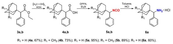 Using a one-stage method which excludes the use of toxic and explosive reagents [10], acting on acids 4a and 4b with equimolar amounts of diphenylphosphoryl azide (DPPA) and triethylamine in toluene medium led to (±)-1-[isocyanato(phenyl)methyl]adamantane 5a and (±)-1-[isocyanato(phenyl)methyl] -3,5-dimethyladamantane 5b, with yields of 95% and 89%, respectively. (±)-1-[Adamantyl(phenyl)methyl]amine hydrochloride 6a was obtained under mild conditions in toluene at room temperature using concentrated hydrochloric acid [14] with 60% yield (Scheme 2).
