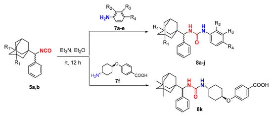 For the synthesis of 1,3-disubstituted urea 8a–k from isocyanates 5a and 5b according to method A, we have chosen halogen-containing (F, Cl) anilines 7a–e, and trans-4-amino-(cyclohexyloxy)benzoic acid 7f, on the basis of which the most active inhibitors of soluble epoxide hydrolase (sEH) were previously obtained [15] (Scheme 3, Table 1).