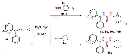 1,3-disubstituted ureas 8a, 8b and 10a–c were synthesized by method B from (±)-1-[adamantyl(phenyl)methyl]amine hydrochloride 6a and aromatic isocyanates 9a–d, as well as cyclohexyl isocyanate 9e, as the closest analog trans-4-amino-(cyclohexyloxy)benzoic acid 7a devoid of an oxophenylcarboxylic fragment (Scheme 4).