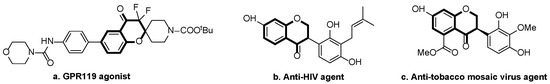 The chroman-4-one framework belongs to the privileged class of heterocycles and acts as a major building block in many natural products, pharmaceuticals, and biologically active compounds [1,2]. In particular, the compounds with substituents at the 3-position of the chroman-4-one exhibit significant physiological and biological activities, such as GPR119 agonist (Figure 1, a) [3], anti-HIV agent (Figure 1, b) [4], and anti-tobacco mosaic virus agent (Figure 1, c) [5] etc. Thus, a number of approaches for the synthesis of 3-substituted chroman-4-one derivatives have been developed, such as transition-metal-catalyzed cross-coupling reaction [6], Stetter reaction [7], and cascade radical cyclization [8,9,10,11,12].