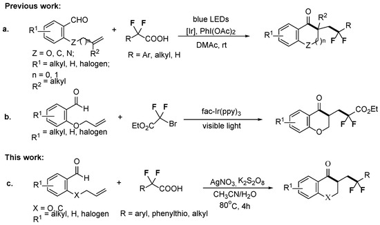 Radical cascade fluoroalkylation/cyclization of alkenes has been proved to be one of the effective methods to obtain fluoroalkyl-containing heterocycle products due to the advantages that it avoids the separation and purification of intermediates [33] and realizes the introduction a fluoroalkyl group while constructing the diversity and complexity of heterocyclic skeletons. However, some fluoroalkyl radicals, such as CF3 radical, CF2H, and CnF2n+1 radical, are electron-deficient σ-radicals and thus prone to add to electron-rich alkenes. Due to electronically unfavorable conditions, it is difficult to realize the free radical cascade fluoroalkylation/cyclization of unactivated or electron-deficient alkenes. Therefore, there are only few reports on the cascade difluoromethylenation/cyclization regarding the synthesis of 3-difluoromethylene-containing chroman-4-one derivatives through the addition difluoromethyl radicals to unactivated alkenes in 2-allyloxybenzaldehydes. The reported methods include that of Zhu’s group, which developed a visible light photocatalytic aryldifluoromethylation/cyclization of alkenes using α,α-difluoroarylacetic acids (Scheme 1a) [34], and Zhou’s group and Ma’s group, which described radical cascade cyclization of alkene aldehydes using a 1-bromo-2-difluoro-containing building block (Scheme 1b) [35,36] under the visible-light photoredox catalysis conditions. Therefore, it is highly desirable to develop new, convenient methods for the synthesis of 3-difluoromethylene-containing chroman-4-one derivatives, to avoid using a relatively expensive photocatalyst in the mild reaction. Our previous research on the decarboxylation of gem-difluoroarylacetic acids under silver-catalyzed condition revealed that aryldifluoromethyl radicals have a slightly electron-rich property relative to the CF3 radical and could react with the electron-deficient activated double bond in allyl sulfones [37]. Herein, we further tried to use aryldifluoromethyl radicals from the decarboxylation of gem-difluoroarylacetic acids under the promotion of the catalytic amount of silver to explore the cascade aryldifluoromethylation/cyclization reaction with unactivated double bonds in 2-allyloxybenzaldehydes to synthesize 3-aryldifluoromethyl-containing chroman-4-one derivatives (Scheme 1c).
