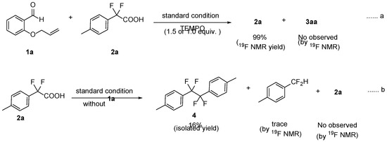 To gain more insight into the reaction mechanism and identify whether a radical pathway is involved in the silver promoted cascade aryldifluoromethylation/cyclization or not, some control experiments were carried out. When 1.0 or 1.5 equiv. of radical scavenger TEMPO were added into the reaction system of 4-methyl difluorophenylacetic acid (2a) and 2-allyloxybenzaldehyde 1a under the standard conditions, the reaction provided neither the desired product 3aa nor adduct of TEMPO with phenyldifluoromethyl radical based on 19F NMR analysis. Additionally, the conversion of 2a was completely inhibited under the standard conditions because 2a almost totally remained in the above reaction system by 19F NMR monitoring (Scheme 2a). We deduced from the results that the reaction may undergo a radical process. To further capture the phenyl difluoromethyl radical to verify this speculation, the reaction of only 4-methyl difluorophenylacetic acid (2a) used as substrate under the standard conditions in the absence of 2-allyloxybenzaldehyde 1a was performed (Scheme 2b). The phenyl difluoromethyl radical self-coupling product 4 was obtained in 16% isolated yield. Thus, it was indicated that the phenyl difluoromethyl radical as intermediate could be involved in the reaction process (Scheme 2).