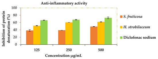 The anti-inflammatory activity results shown in Figure 2 showed that the extracts of H. strobilaceum and S. fruticosa significantly decreased the rate of inhibition of protein denaturation. The statistical study showed that there were no significant differences (p > 0.05) between the two extracts and the positive certificate (Diclofenac sodium).