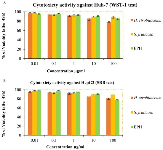 In vitro cytotoxicity assay for the hydro-methanolic extracts of H. strobilaceum, S. fruticosa and the positive control (EPH) against Huh-7 (A) and HepG2 (B) cells (0.01, 0,1, 1, 10, and 100 μg/mL).