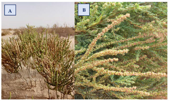 Plant material. Morphological characters of the aerial parts of two halophytes, (A) Halocnemum strobilaceum Pall and (B) Suaeda fruticosa L.