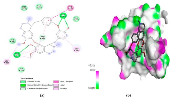 For the caspase-9 target protein, the best phytochemical limonin with a binding affinity of −10.5 kcal/mol interacted with LeuA:177, ArgA:178, GlyA:238, TrpA:354, and ArgA:355 amino acids of the active pocket (Figure 3). Two conventional H-bonds (i.e., GlyA:238 and ArgA:355) were observed in this complex. Similarly, the second best phytochemical obamegine showed interactions with LeuA:244, PheA:246, AsnA:265, LeuA:335, ProA:336, and ProA:338 residues of the active site (Figure 4). Two conventional H-bonds (i.e., AsnA:265 and ProA:336) were also observed in this complex. The remaining phytochemicals, i.e., liquoric acid, 3-O-caffeoyloleanolic acid, and botulin, also showed strong binding interactions to the amino acids of the caspase-9 active site (Figures S4–S6). Among the best-selected phytochemicals, the compounds liquoric acid, limonin, berbamine, isotetrandrine, and obamegine showed strong interactions with both receptor proteins (i.e., EGFR and caspase-9).