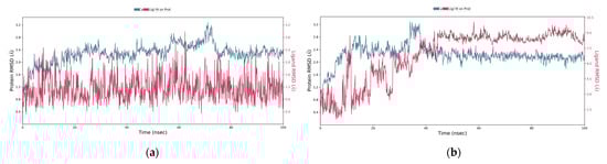 The top compound against each receptor protein was further studied by molecular dynamic (MD) simulations. The Desmond (Schrödinger LLC) was employed for 100 nanoseconds to model MDs in replicates [36]. For the docking studies, the earliest phase of protein–ligand complex was used because the molecular docking study predicts the binding state of the ligand molecule in static situations. Molecular docking provides a static view of the best binding conformation of a molecule at the active site of a protein and is therefore important [37]. Typically, MD simulations integrate Newton’s classical equation of motion, computing the movement of atoms over time. The MD simulations were used in the current study for the prediction of ligand-binding status in the physiological environment [38,39].