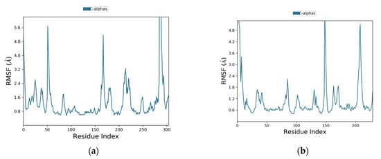 The plots of residue wise root mean square fluctuation (RMSF). (a) RMSF plot of EGFR and (b) RMSF plot of caspase-9 as receptor proteins.