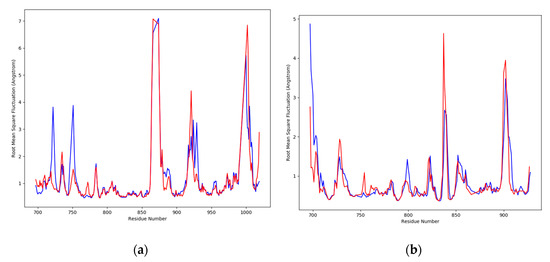 The plots of residue wise root mean square fluctuation (RMSF) of receptor proteins in apo and bound states. (a) RMSF plot of EGFR protein (in apo and bound state) and (b) RMSF plot of caspase-9 protein (in apo and bound state). The red peaks are showing apo proteins, while the blue peaks are showing values for bound states.
