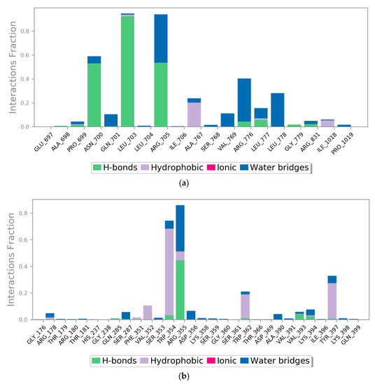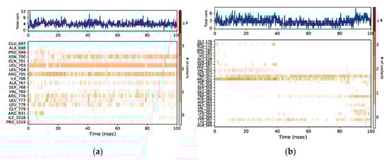 The stacked bar charts were standardized for the trajectory course, which shows that if the value of contact is 1.0, then it means that the exact interaction is retained for 100% of MD simulation period. Values > 1.0 are also possible, as some of the amino acids interact multiple times to the ligand molecule through the same subtype of interactions. The interactions of liquoric acid with EGFR are shown in Figure 10a and the interactions between limonin and caspase-9 are shown in Figure 10b. The interactions that lasted for longer than 30% of the MD simulation duration in their respective trajectories (i.e., 0.00 to 100 ns) are shown in the figure.