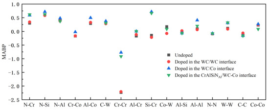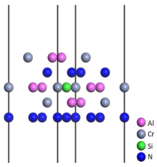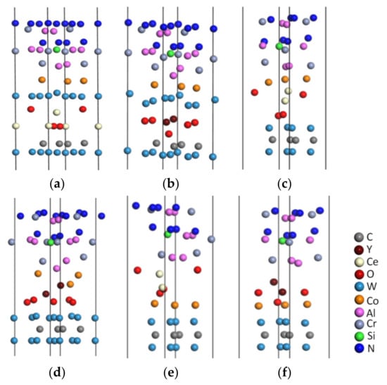 - The adhesion work values were calculated for three interface models with various terminal atoms, namely CrAlSiNSi/WC-Co, CrAlSiNN/WC-Co, and CrAlSiNAl/WC-Co. The analysis showed that the adhesion work was the highest at the CrAlSiNSi/WC-Co interface (4.312 J·m−2) and the lowest at the CrAlSiNAl/WC-Co interface (2.536 J·m−2).
