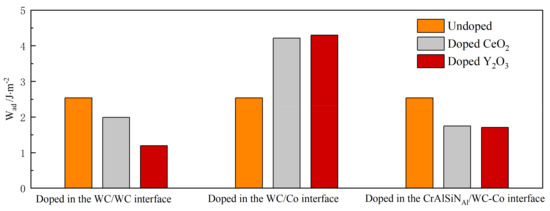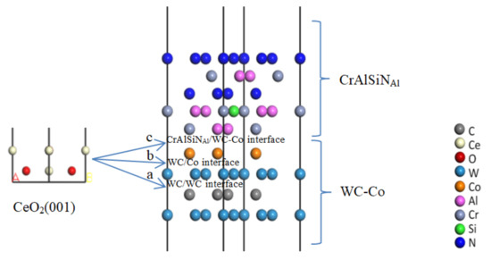 - Based on the CrAlSiNAl/WC-Co interface model with the lowest interface bonding strength, we doped CeO2 or Y2O3 into the WC/WC, WC/Co, and CrAlSiNAl/WC-Co interfaces to obtain the doped models.