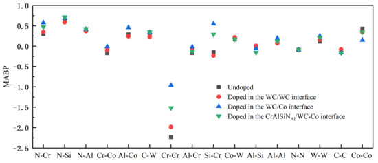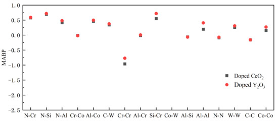 - Of the two rare earth oxides, Y2O3 doping into the WC/Co interface improved the interface bonding properties more significantly than CeO2 doping. In CrAlSiNAl/WC/CeO2/Co, the adhesion work at the CrAlSiNAl/WC-Co, CeO2/Co, and WC/CeO2 interfaces was 4.216, 3.235, and 4.615 J·m−2, respectively. In CrAlSiNAl/WC/Y2O3/Co, the adhesion work values at the CrAlSiNAl/WC-Co, Y2O3/Co, and WC/Y2O3 interfaces were 4.297, 3.982, and 4.724 J·m−2, respectively. The adhesion work with Y2O3 doping was consistently higher than that with CeO2 doping. The constructed charge density difference maps revealed that Y2O3 doping into each interface consistently resulted in a higher charge density, a higher number of charge transfers, and stronger interatomic interactions. The MABP of the Y2O3-doped models was consistently higher than that of the CeO2-doped models. These results strongly suggested that Y2O3 doping more significantly increased the interatomic interactions and reduced the interatomic repulsion in the Al terminal model (CrAlSiNAl/WC-Co) compared to CeO2 doping. Therefore, when rare earth oxides are doped at the WC/Co interface, the doping of Y2O3 has a better effect in terms of improving the interface bonding performance of the Al terminal model (CrAlSiNAl/WC-Co).