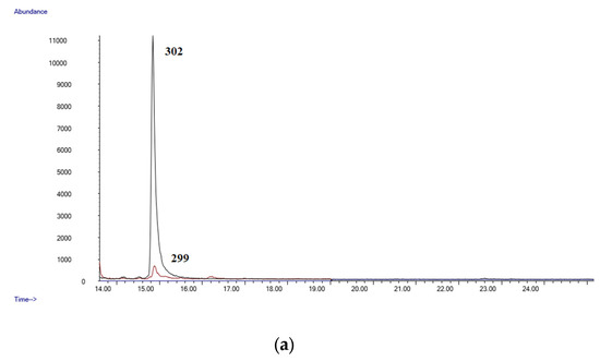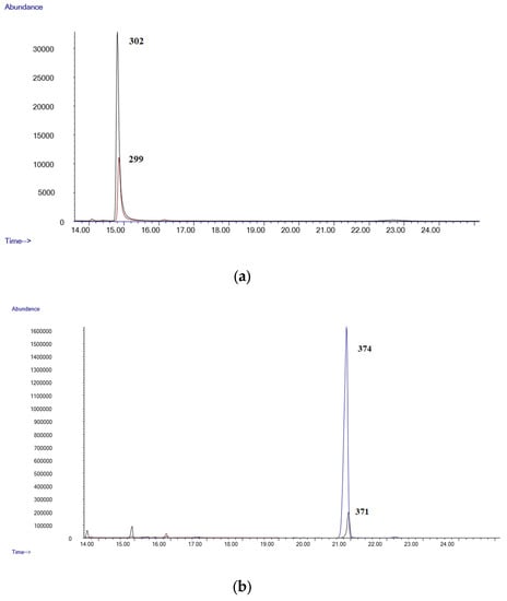 - GC-MSGC-MS analyses were performed in an Agilent 6890 Gas Chromatograph equipped with a 7683B automatic liquid sampler, coupled with an Agilent 5973 mass selective quadrupole detector (Agilent Technologies, Las Rozas, Madrid, Spain). The GC injection port was set at 250 °C in splitless mode (purge time 0.75 min). The GC was equipped with an Agilent 19091S-133U 5% phenylmethylsyloxane capillary column, 30 m × 0.25 mm. i.d., 0.50 µm film thickness (purchased by Agilent Technologies, Las Rozas, Madrid, Spain). The oven temperature was held at 90 °C for 1 min, then at 35 °C/min to 200 °C, then at 10 °C/min to 260 °C and held 15 min. Helium was used as carrier gas at a flow of 1 mL/min. The mass detector operated in electron ionization at 70 eV. Initially, a mixture of standards of all the compounds was analyzed in full scan mode (mass range 50–550 amu). Quantifier and qualifier ions used for each analyte were selected based on their abundance and mass-to-charge ratio (m/z). Owing to their reproducibility and lack of interferences, high-mass ions were selected whenever possible. Upon the selection of ions, the mass analyzer was operated in selected ion monitoring (SIM) acquisition mode. All diagnostic ions and retention times are listed in Table 5.