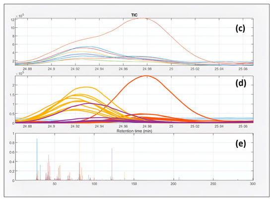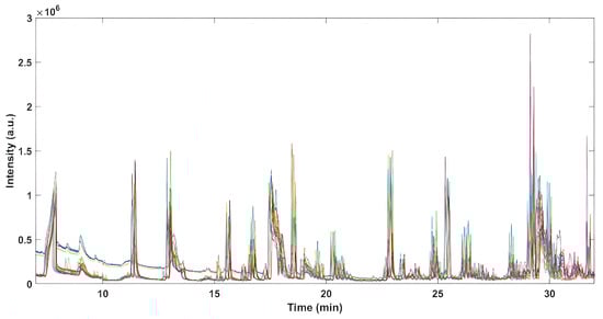 Headspace profiles obtained for all samples are reported in Figure S1, while Figure 1 depicts the final signals used in the further data analysis, where the first 7 min and the last 23 min of the chromatograms were excluded, as they only represented the peaks due to adsorbed atmospheric gases and the absence of relevant analytes, respectively.