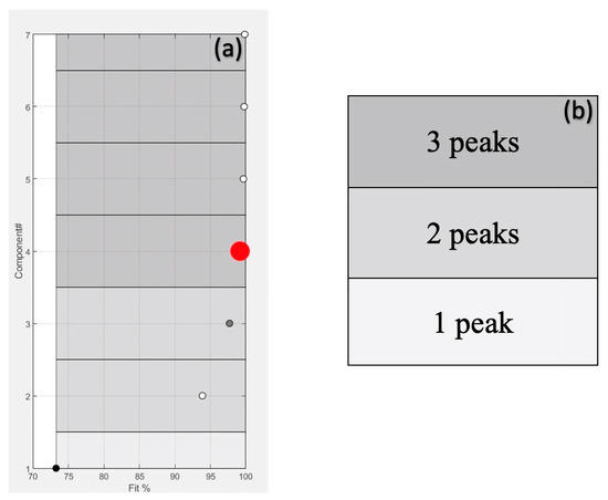 The workflow in PARADISe starts by determining the right number of components to include in the PARAFAC2 modelling. In this study, the number of explored factors ranged from 1 to 7, and the maximum number of iterations to reach convergence was set as equal to 3000 (default parameter). The first used criterium was to select the smallest number of components that resolve the highest number of peaks [21] and, at the same time, describe the maximum variance (Fit %). To achieve this, PARADISe utilises a machine learning routine that can identify chromatographic peaks. However, the final decision of the number of components to be used for peak integration and for generating the report is due to the user. For the sake of clarity, in Figure 2, an example of the graphical interface is reported, which summarised the information used for modelling one of the selected intervals (retention time, Rt from 24.87 to 25.06 min) considered in this study. The box in Figure 2a reports the explained variance (Fit%) for each PARAFAC2 model as a function of the number of components. The intensity of the grey colour (Figure 2b) is due to the number of peaks resolved by the respective components. The TIC signals of the selected interval and the resolved components by the model are reported in Figure 2c,d, respectively. From the box of Figure 2d, the user can evaluate and choose the components that effectively represent the chromatographic peaks. In the reported example, four components are selected to build the model since they are the best compromise in terms of explained variance and number of resolved compounds (Figure 2a,d). From the investigation of Figure 2d, three of these components correspond to chromatographic peaks (purple, yellow, and red signals) and one (blue signal) represents the baseline. Finally, the peaks are putatively identified, comparing the resolved mass spectra with the spectra in the available libraries (NIST 08 and Wiley 275), to be 2-pentyl-furan, ethyl hexanoate, and octanal, respectively.