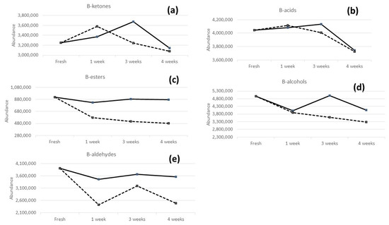 Figure 3. Evolution of the main groups of volatile compounds, namely ketones (a), acids (b), esters (c), alcohols (d), and aldehydes (e), in B bread samples stored in refrigerator (solid line) and in the freezer (dashed line).
