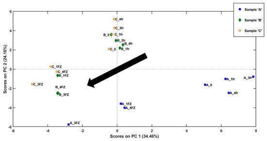 The analysis of the scores of PC1 vs. PC2 (Figure 4) shows a trend in the distribution of scores for all three types of bread (A, B, and C). Indeed, considering each type of sample, bread stored in a refrigerator has higher scores in PC1 compared to those stored in a freezer. This trend is visible as a black arrow in the graph, and it goes from positive to negative values as the samples move from being stored in a refrigerator at 4 °C to being stored in a freezer at −20 °C.