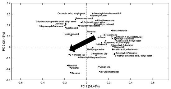 Figure 5. Analysis of VOCs of bread samples sampled with Arrow-SPME. PC1 vs. PC2 loadings plot obtained by PCA applied on selected areas from PARADISe analysis.