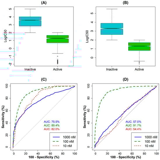 Distribution of the IC50 values for (A) active vs. inactive AChE inhibitors; (B) active vs. inactive BACE1 inhibitors; ROC−curve−based selection of cut-off values for (C) AChE inhibition and (D) BACE1 inhibition.