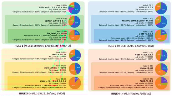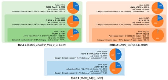 The decision trees are combinations of rules describing the relationships between molecular descriptors []. Since the rules are the basis of activity predictions, we define the chemical space of active inhibitors following the rule paths that lead to the highest classification accuracy of the positive class. As the RF models are ensemble decisions trees, these activity rules were mainly based on CART and CHAID models. These activity rules are of great interest because the ligand-based design approaches implemented in this study are based on the structural fragments of the active compounds that accomplished the rules and the predictions of all the constructed ML models.