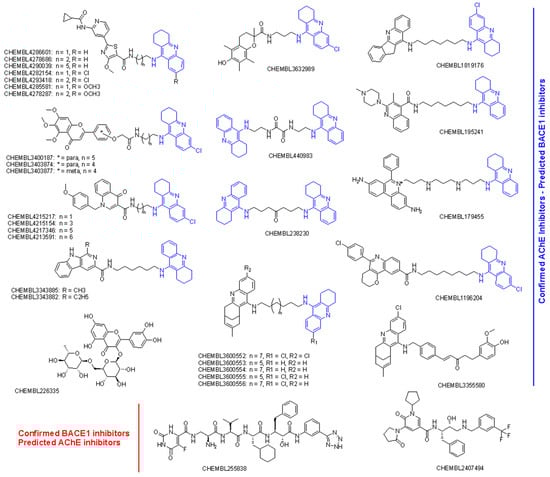A total of 34 compounds were predicted to be active dual inhibitors against AChE and BACE1. The prediction results and experimental measurements are summarized in Table 5, and the chemical structures of these 34 compounds are shown in Figure 4. Most of the confirmed AChE and predicted BACE1 inhibitors were tacrine derivatives. Only two compounds were not tacrine analogues, including a shogaol–huprine hybrid (CHEMBL3355580) and rutin (CHEMBL226335), a natural flavonoid glycoside from citrus. Whereas rutin has been shown to be able to impair BACE1 cleavage by acting as a βAPP-selective BACE1 inhibitor [], huprine-based hybrids have shown promise as AChE inhibitors with potential inhibitory effects against both β-amyloid peptide (βA) and tau aggregation []. In fact, five compounds with huprin–tacrin hybrid structures were predicted to be AChE and BACE1 dual inhibitors. Interestingly, these inhibitors were experimentally shown to act as multitargets, with inhibitory effects on AChE and AChE-induced Aβ1−40 and PrP106−126 aggregation, BChE, self-induced Aβ1−42 aggregation, and BACE1 [].