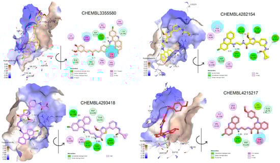 The docking results of these compounds showed their good binding interactions with BACE1 (PDB ID: 2WJO) []; however, most of the binding energies estimated by docking scores (dG) are lower than that of the co-crystal ligand, which had a value of −15.23 kCal/mol. This value was determined after the native ligand, namely QUD, a catalytic inhibitor (2-(2-amino-6-phenoxy-4H-quinazolin-3-yl)-2-cyclohexyl-ethyl)-amide, was redocked into the active site of BACE1 as a reference compound (r.m.s.d = 0.6678 Å). The docking score applied is based on GBSA/MM function, which combines numerous weighted energy terms, including van der Waals, H-bonding, and the hydrophobic, solvation, and desolvation energy changes []. Based on dG values, only four compounds exhibited better binding energy than QUD; these were CHEMBL4282154, CHEMBL4293418, CHEMBL3355580, and CHEMBL4215217 [,,]. Notably, the first two compounds were designed by combining 6-Cl-tacrine with a pyridine carboxamide moiety, a promising fragment found in glycogen synthase kinase-3β (GSK-3β) inhibitors (Figure 4) []. According to the docking interactions (Figure 5), all the compounds were able to bind strictly to the active site of BACE1, with multiple H-bonds and stacking interactions from the 6-Cl-tacrine and huprin moieties to Val69, Tyr71, Ile226, Val332, and Tyr198. It is worth highlighting that all the compounds consistently participate in two H-bonds with Asp32 and Asp228 (Asp dyad), which are among the key interactions of the catalytic mechanism of BACE1 (Figure 5).