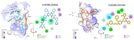 In contrast to the screening of BACE1 inhibitors, the screening of AChE inhibitors using activity rules and QSAR models revealed only two active compounds, CHEMBL255838, a polypeptide with a 5-fluoroorotyl group [], and CHEMBL2407494, a hydroxyethylamine-based inhibitor with a pyridone ring []. They were predicted to be AChE inhibitors and had IC50 values <100 nM against the enzyme BACE1 (Table 5). Docking simulations revealed that they were able to bind to the active site of the AChE enzyme with similar or even better binding energies than the reference drug donepezil (dG = −14.35 kCal/mol, r.m.s.d = 0.389 Å) []. Both CHEMBL255838 and CHEMBL2407494 were able to interact with residues in the peripheral anionic site (PAS) of AChE, such as Tyr72, Tyr341, and Trp286, and those in the choline binding site, such as Trp86 and Gly448 (Figure 6). Moreover, these compounds were able to form stacking interactions with Phe295 and Phe338 at the acyl binding pocket, which are important for selective inhibition of AChE. The active site of BACE1 (beta-secretase 1) is relatively large and deep [], whereas the active site of AChE is shorter and narrower []. Although the active sites of AChE and BACE1 have different structures and residues, both enzymes are homologous in their catalytic mechanisms. The serine residue in AChE and the aspartic acid residue in BACE1 both act as nucleophiles that attack the substrate to form a tetrahedral intermediate that eventually collapses and releases the products. The role of the inhibitors is to interact with the active site and prevent the substrates from reaching the active site. The obtained results confirmed the inhibition of the AChE enzyme by CHEMBL255838 and CHEMBL2407494.