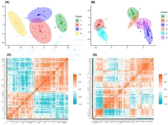 Results from the clustering using the k−MCA algorithm. (A) The 67 representatives of the AChE database; (B) the 114 representatives of the BACE1 database. Correlation matrix of clustering features computed for (C) 67 AChE inhibitors and (D) 114 BACE1 inhibitors.