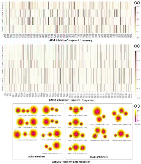 Fingerprint frequency among (A) AChE and (B) BACE inhibitors in each cluster; (C) fragment visualization of the most active inhibitors by Murcko−type decomposition algorithm [].