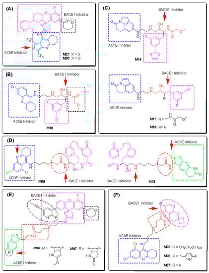Structural design of novel AChE and BACE1 dual inhibitors. 13 designed compounds are sorted in 6 groups (A–F) according to their structural similarity. The active fragments are highlighted and colored according to their targets. The * indicates in each structure where that substituent group attaches to the designed molecule.