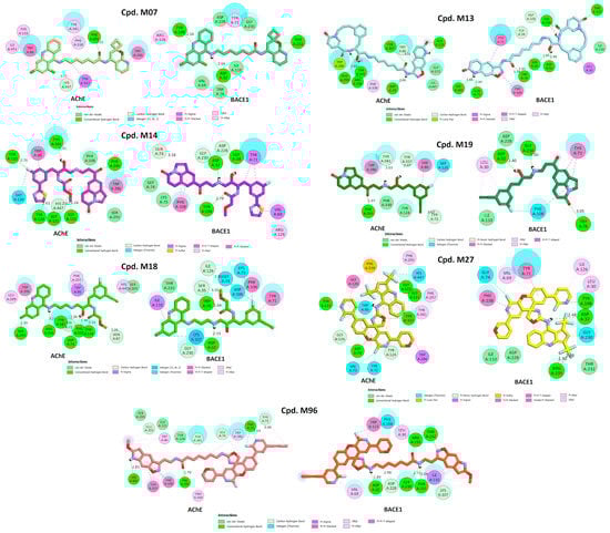 Two-dimensional interactions of designed compounds with residues of the active sites of AChE and BACE1.