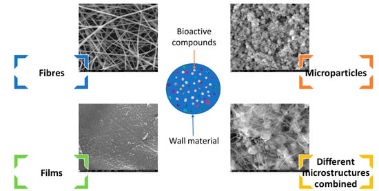 In fact, the quality and efficient improvement of these compounds’ benefits are the main strategies being considered when developing new products [2]. In this regard, microencapsulation technologies of compounds are an option to preserve and enhance the quality of the active ingredients [3,4]. These technologies involve the coating and protection of bioactive compounds by a produced barrier (wall material) (Figure 1); they allow for the improvement of the compound’s stability and solubility, thereby slowing down the release profile, and masking the flavour, odour, or taste [5].