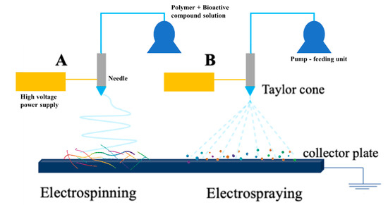 Schematic illustration of electrohydrodynamic technologies: (A) electrospinning, (B) electrospraying setups [3].