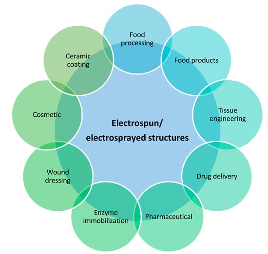 Electrospun/electroprayed structures with functional advantages can be applied to several applications, such as active food (functional products, packaging, preservation/industry), pharmaceuticals, drug delivery, enzyme immobilization, tissue engineering, and wound dressing, as observed in Figure 3 [6,28].