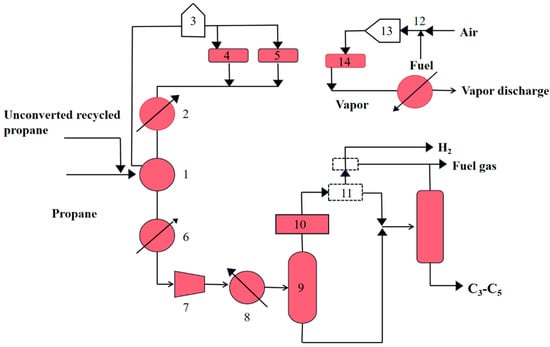 Process diagram of Catofin dehydrogenation unit. (1) Heat exchanger; (2) Steam generator; (3) Heating furnace; (4) Purge section reactor; (5) Process section reactor; (6) Cooler; (7) Compressor; (8) Air cooling; (9) Flash tank; (10) Dryer; (11) Cold box; (12) Gasifier; (13) Heater; (14) Regeneration section reactor.