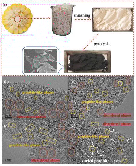 (a) Preparation process of corncob-derived hard carbon materials. High-resolution TEM images of CC-1000 (b), CC-1200 (c), CC-1400 (d), and CC-1600 (e).