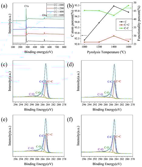 (a) XPS wide spectra; (b) functionality percent and C atom percent; high-resolution of C1s XPS spectra of (c) CC-1000, (d) CC-1200, (e) CC-1400, and (f) CC-1600.