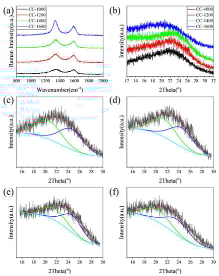 (a) Raman spectra; (b) XRD patterns of the all as-obtained samples; the (002) peak fitting curves of the XRD pattern of (c) CC-1000, (d) CC-1200, (e) CC-1400, and (f) CC-1600.