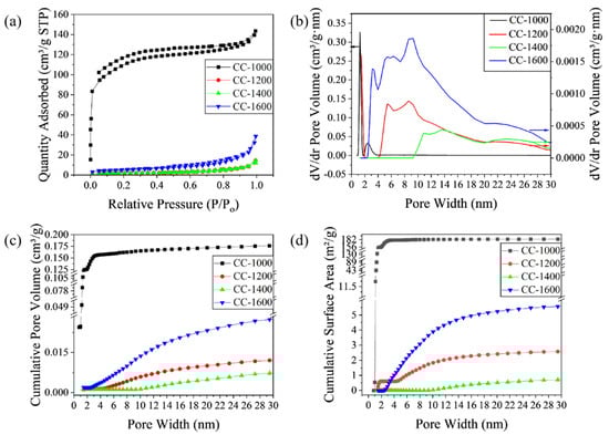 The curves of the cumulative pore volume and surface area vs. the pore size are displayed in Figure 4c and Figure 4d, respectively. For CC-1000, a sharp increase in cumulative surface area and pore volume occurs at pore sizes below 2 nm, but no obvious growth at above 2 nm, indicating nearly all the pores concentrate in the range of 0.8~2 nm. In contrast, for CC-1200, CC-1400, and CC-1600, a negligible accumulation of surface area and pore volume is observed below 2 nm, and a gradual rise in pore volume at the range of 2~30 nm (4.6~20 nm for CC-1200, 9~20 nm for CC-1400, and 2.5~20 nm for CC-1600) indicates that as-obtained samples pyrolyzed above 1200 °C contain abundant mesopores with wide pore size distribution. CC-1400 exhibits a smaller mesopore volume (0.017 cm3/g) than CC-1200 (0.021 cm3/g) and CC-1600 (0.049 cm3/g). In summary, CC-1400 forms a pore structure with larger pore size (larger than 9 nm), smaller mesoporous volume, and wide pore size distribution, which may be conducive to sodium insertion/extraction.