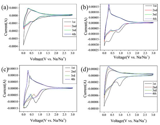 Figure 5 displays the cyclic voltammograms (CV) curves of CCs in the initial four cycles at a scan rate of 0.25 mV/s within a voltage range of 0.01~3.0 V. As indicated in Figure 5a–d, all the electrodes exhibit a sharp cathodic peaks at ~0.1 V, and a broad peak between 0.5~1.2 V appears in the first discharge step; however, they are weakened and overlapped in the subsequent cycles. This phenomenon is generally explained by the irreversible reactions mainly due to the formation of solid-electrolyte interphase (SEI) film [11]. The peak at 0.1 V generally corresponds to the filling of sodium in pores, and the wide peak of 0.5~1.2 V is related to the storage of sodium between graphite layers [2,4]. For the anodic process, the peak centered at 0.1 V indicates the Na+ extraction from the carbon electrode. Compared to other materials, CC-1400 shows more pronounced peaks near 0.8 V and 0.01 V, indicating excellent plateau and slope capacity. In addition, the initial irreversible capacity of CC-1400 is significantly lower than that of other hard carbons, indicating that CC-1400 has a higher ICE.