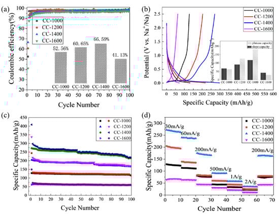 The rate capability is assessed at the current densities from 30 mA/g to 2.0 A/g to evaluate the dynamic performance of the CCs’ electrodes. As shown in Figure 7d, CC-1000 exhibits a reversible specific capacity of 125.23, 112.66, 76.70, 43.77, 33.04, 22.29, and 72.52 mAhg−1 at the current rate of 30 mA/g, 60 mA/g, 200 mA/g, 500 mA/g, 1.0 A/g, 2.0 A/g, and 200 mA/g, respectively. At the same current densities, CC-1200 receives a reversible specific capacity of 198.49, 137.13, 81.84, 59.33, 43.37, 24.61, and 79.71 mAhg−1, respectively. CC-1400 delivers a reversible specific capacity of 267.06, 237.31, 169.48, 90.59, 57.64, 35.44, and 165.07 mAhg−1 at the current rate of 30 mA/g, 60 mA/g, 200 mA/g, 500 mA/g, 1.0 A/g, 2.0 A/g, and 200 mA/g, respectively. Meanwhile, CC-1600 exhibits a reversible specific capacity of 67.46, 63.90, 44.11, 30.65, 20.75, 11.37, and 43.30 mAhg−1, respectively, at the same current densities. All CCs show moderate rate capacity, and the rate capacity of CC-1400 still achieves the maximum value, which indicates the excellent rate performance of CC-1400. It may be attributed to the more ordered graphite microcrystalline structure and the pore structure with wide distribution and larger size. Overall, CC-1400 exhibits the best sodium storage performance considering the reversible capacity, ICE, rate capability, and cycling performance.
