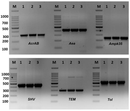 Amplification of virulence genes of Klebsiella pneumoniae isolates by single PCR. Amplification of AcrAB gene (312 bp), amplification of Aea gene (410 bp), amplification of Ompk35 gene (241 bp), amplification of SHV gene (436 bp), amplification of TEM gene (295), and amplification of Tol genes (527). M: 100 bp DNA ladder, 1–3: some positive isolates.