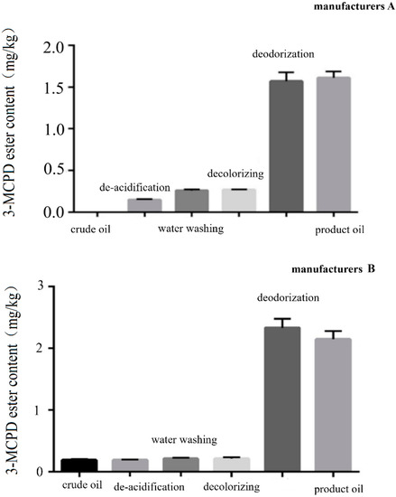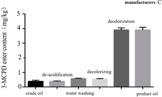 The influence of different refining processes on the formation of 3-MCPD ester, measured in the camellia oil refining process of three different manufacturers (A–C).